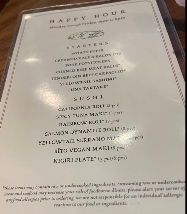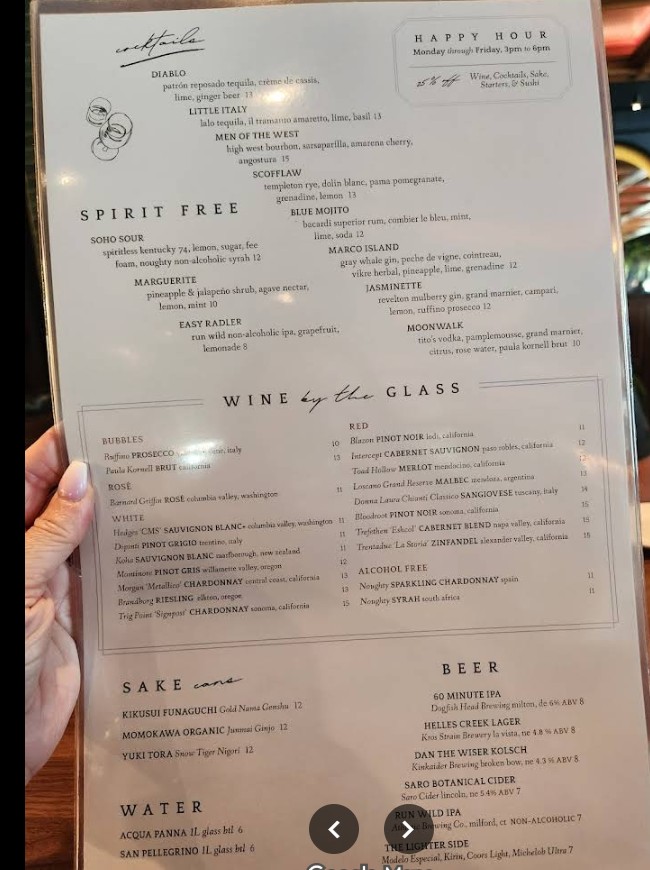 Love the aesthetic of this restaurant! Stopped in during happy hour and everything we ordered was very delicious! The cacio e Pepe was or favorite and the sushi was outstanding! Our drinks were very good and staff was very friendly! Meg our waitress was awesome and super friendly with any questions we may have had! Will def return for dinner soon!!
